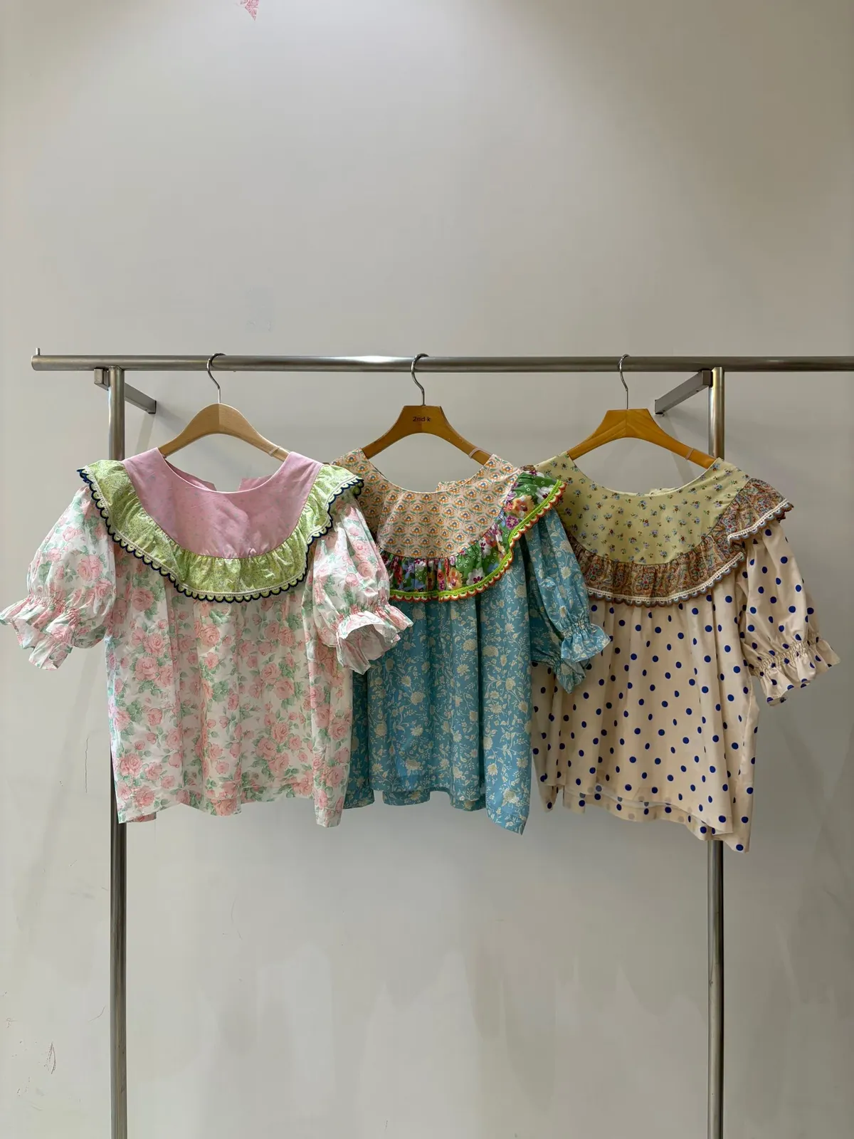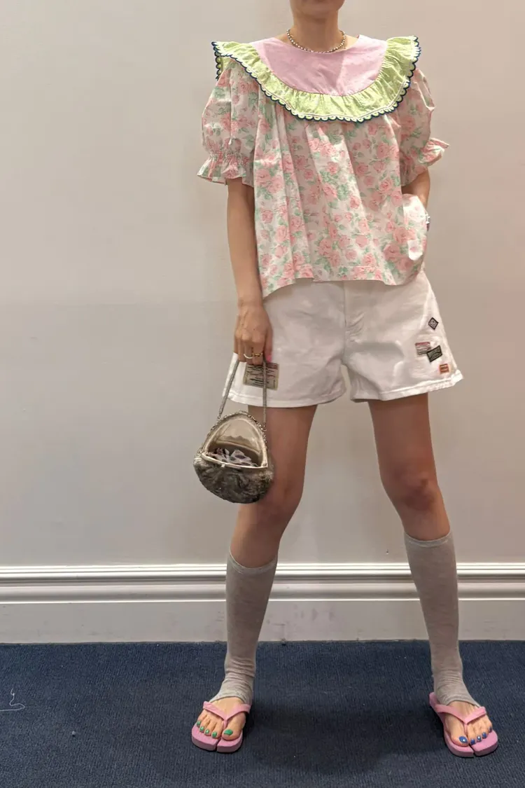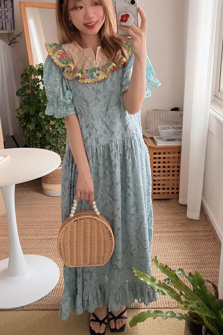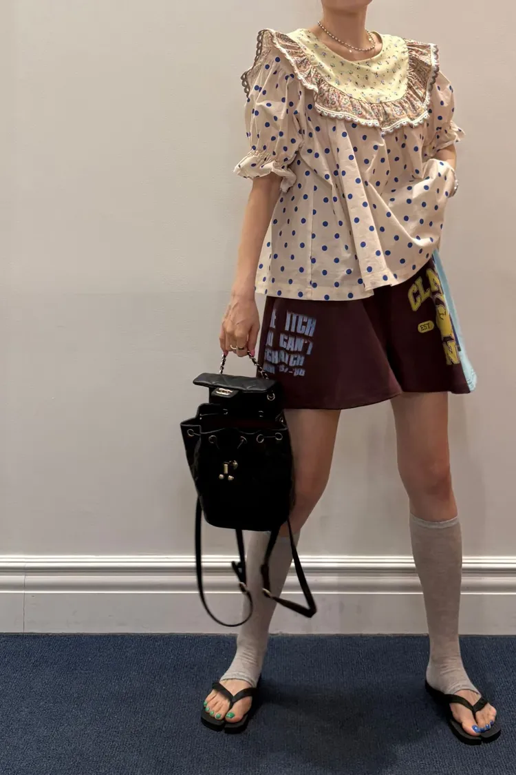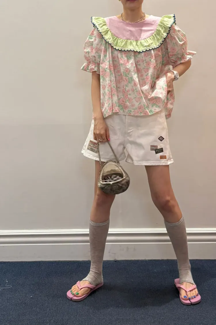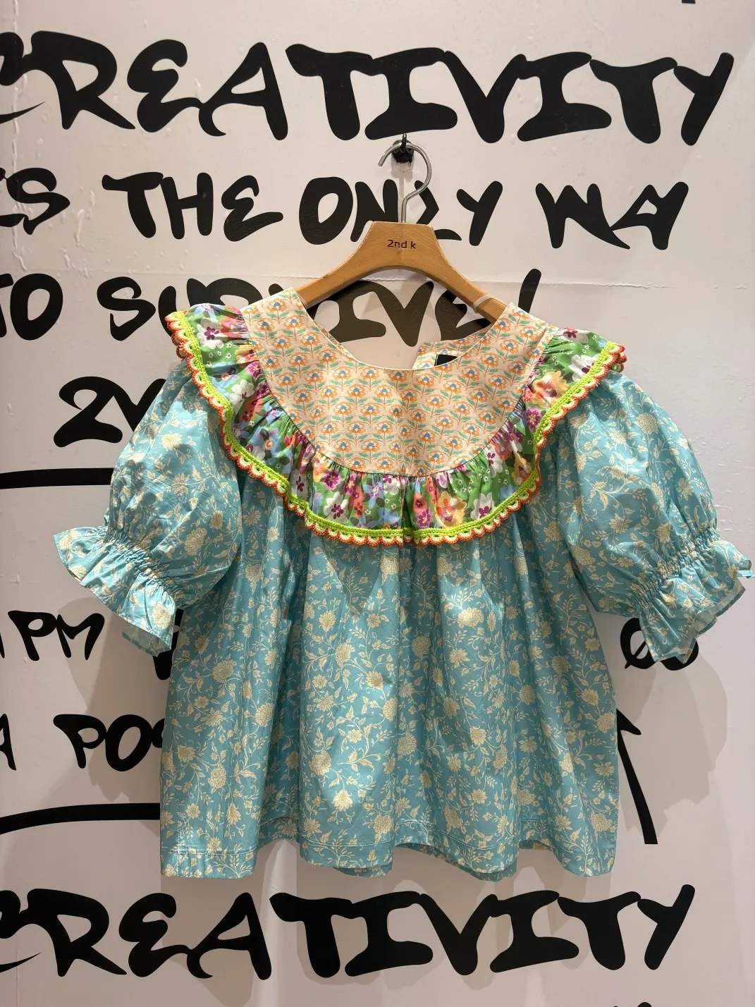 歐膩最拿手的印花拼接設計來囉! 一件直接給你三種印花的層次感 小碎花、點點到復古圖樣拼接 每一面都像精心搭好的穿搭,完全不無聊,越看越有味 棉料材質,寬鬆傘狀版型,S-L妞都可以穿 正反兩穿,一面是圓領、一面是小V領 圓領還特別做了刺繡撞色織帶滾邊,讓整體更有設計感 再搭配蓬蓬袖,復古中帶點俏皮