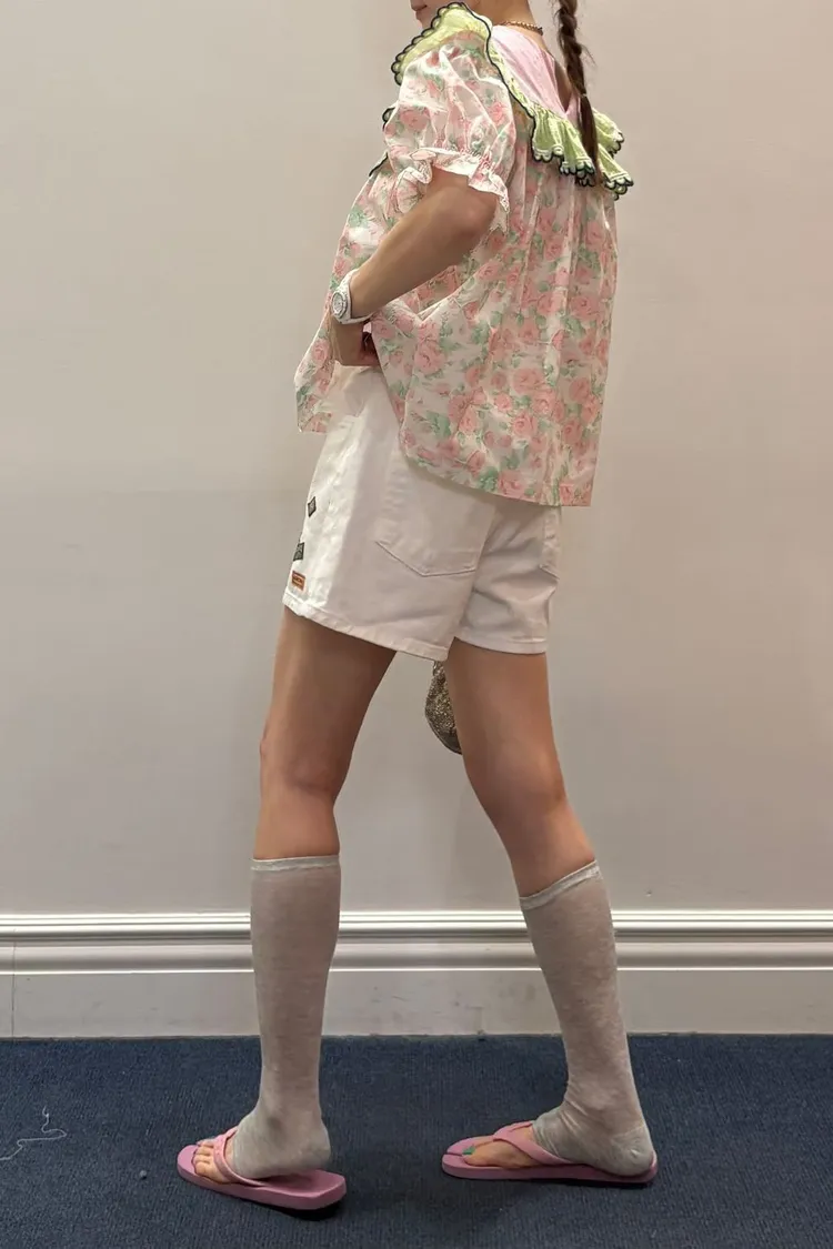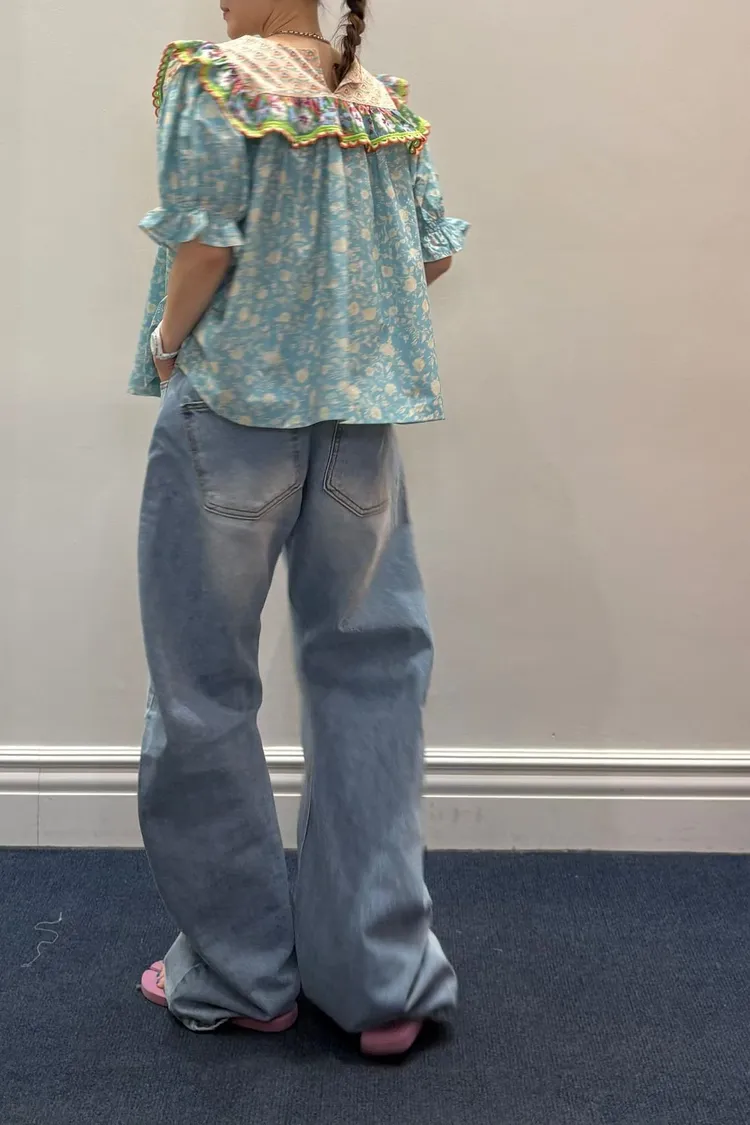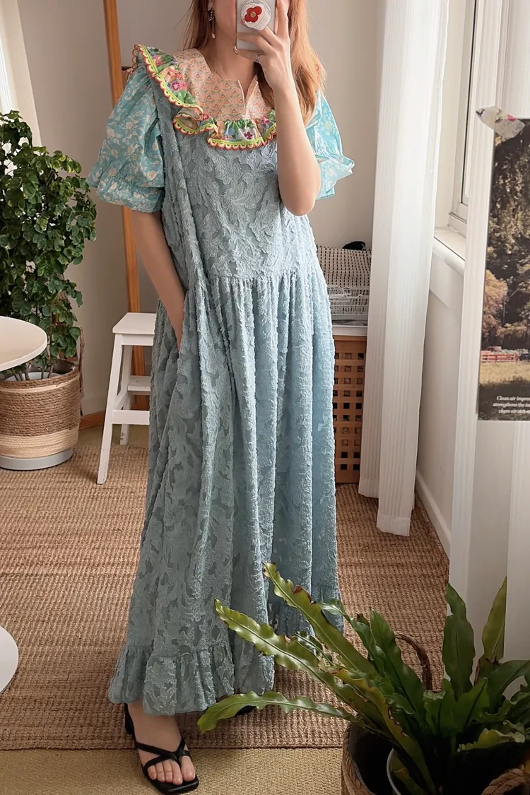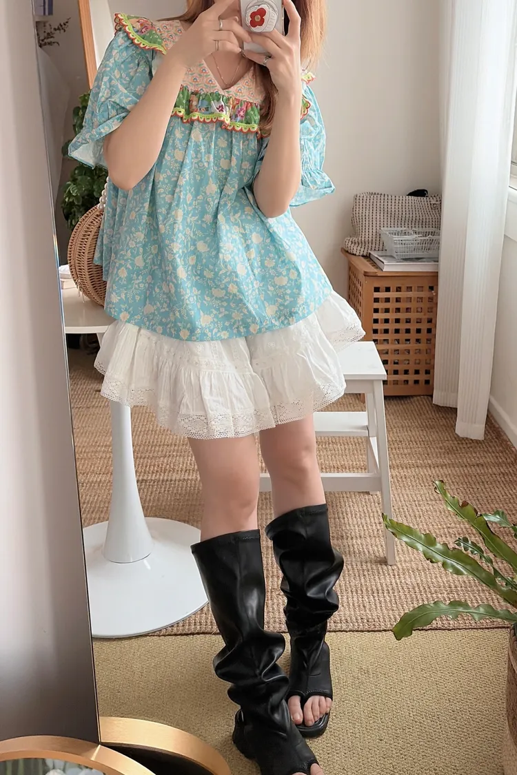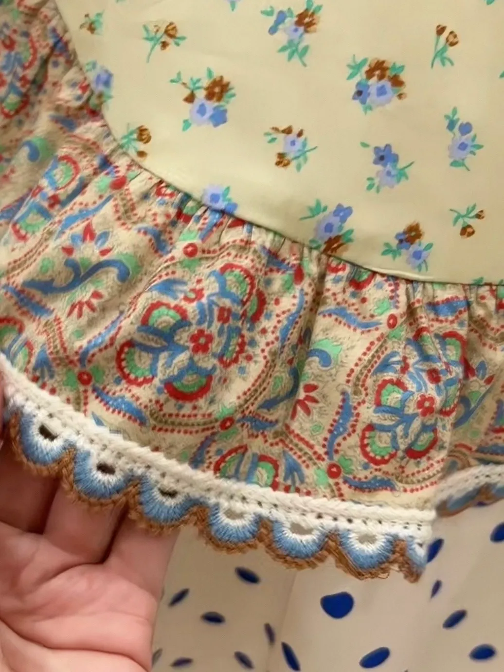 歐膩最拿手的印花拼接設計來囉! 一件直接給你三種印花的層次感 小碎花、點點到復古圖樣拼接 每一面都像精心搭好的穿搭,完全不無聊,越看越有味 棉料材質,寬鬆傘狀版型,S-L妞都可以穿 正反兩穿,一面是圓領、一面是小V領 圓領還特別做了刺繡撞色織帶滾邊,讓整體更有設計感 再搭配蓬蓬袖,復古中帶點俏皮