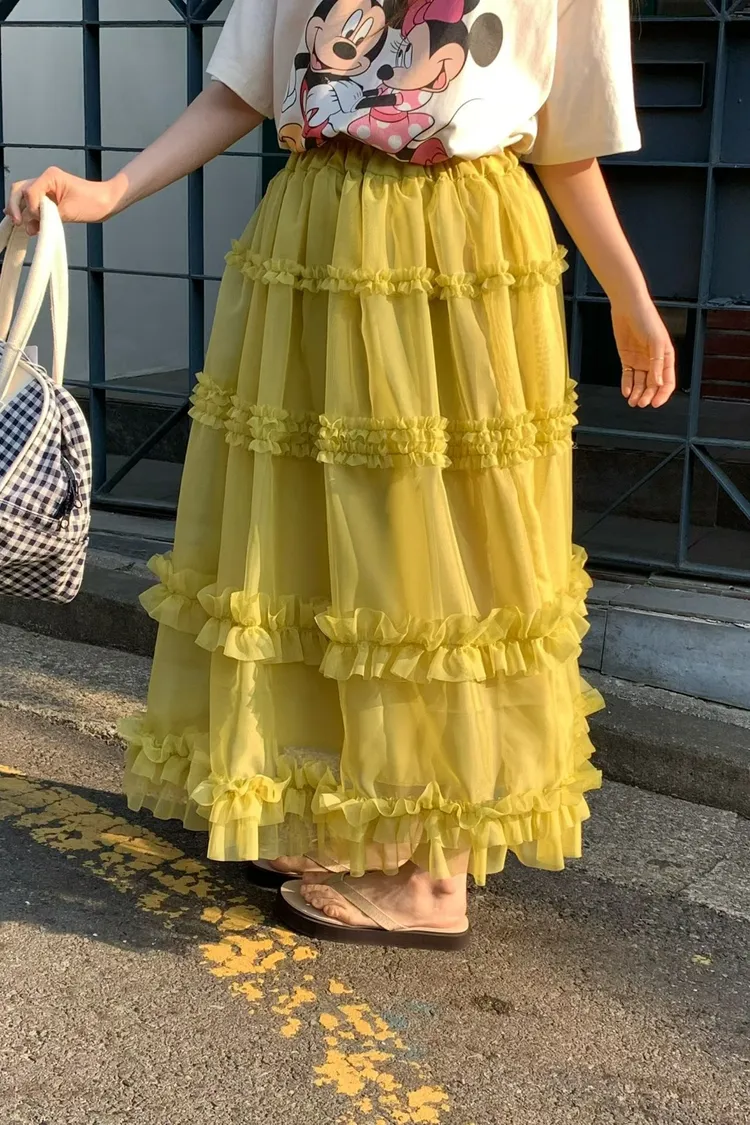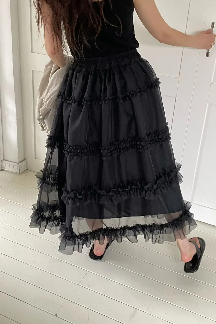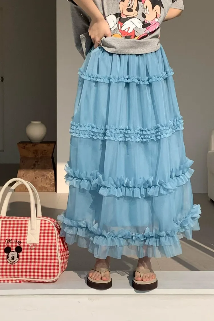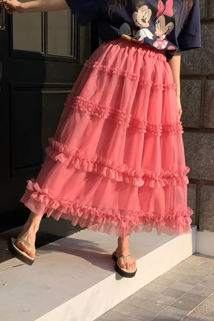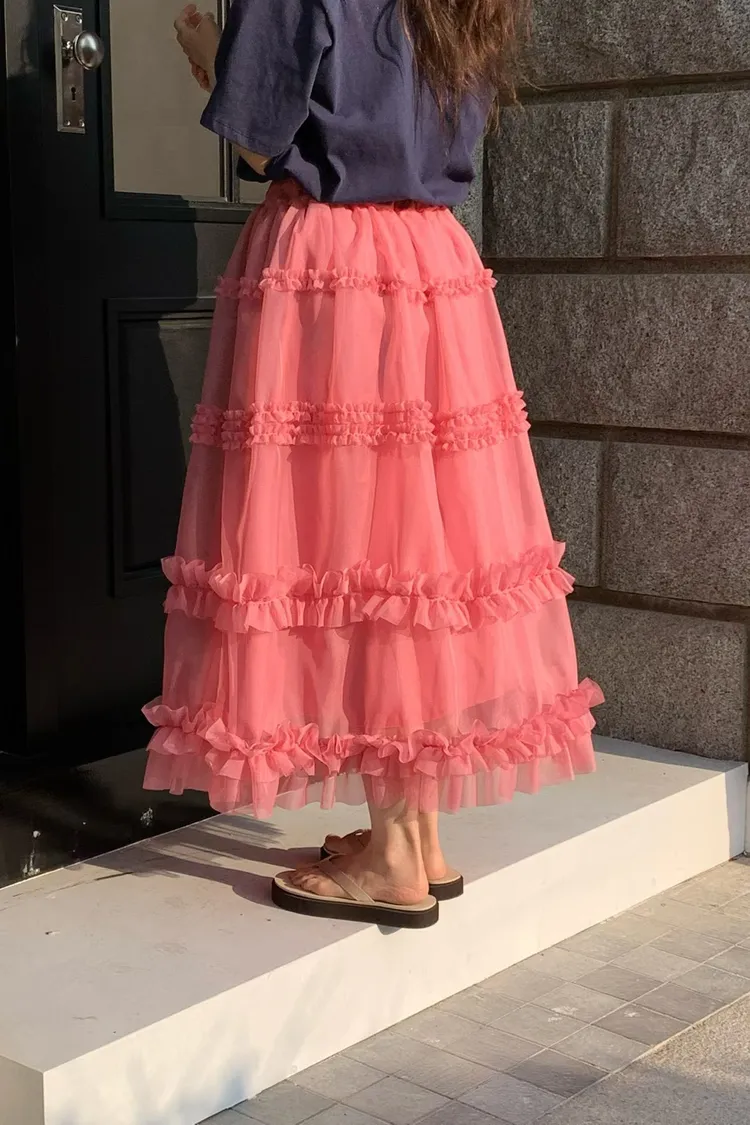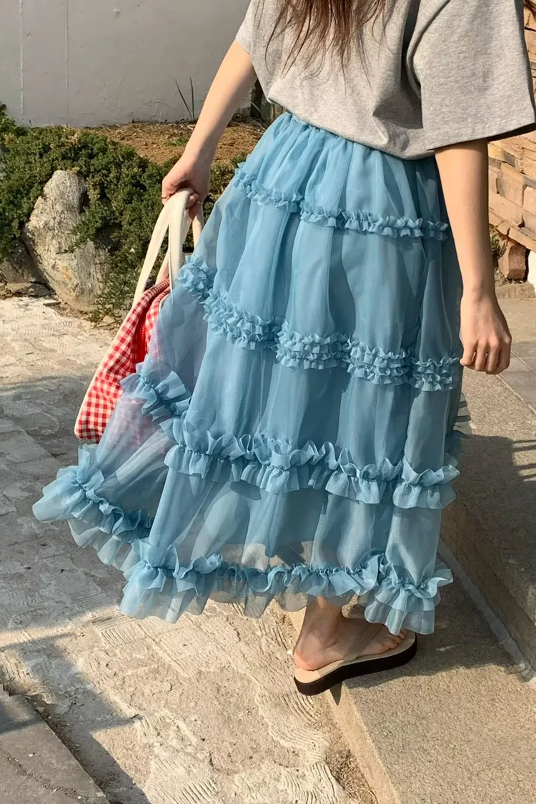 RLV19漸變抓摺滾邊網紗半身裙