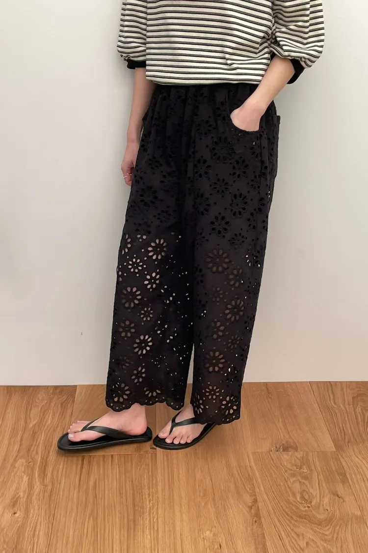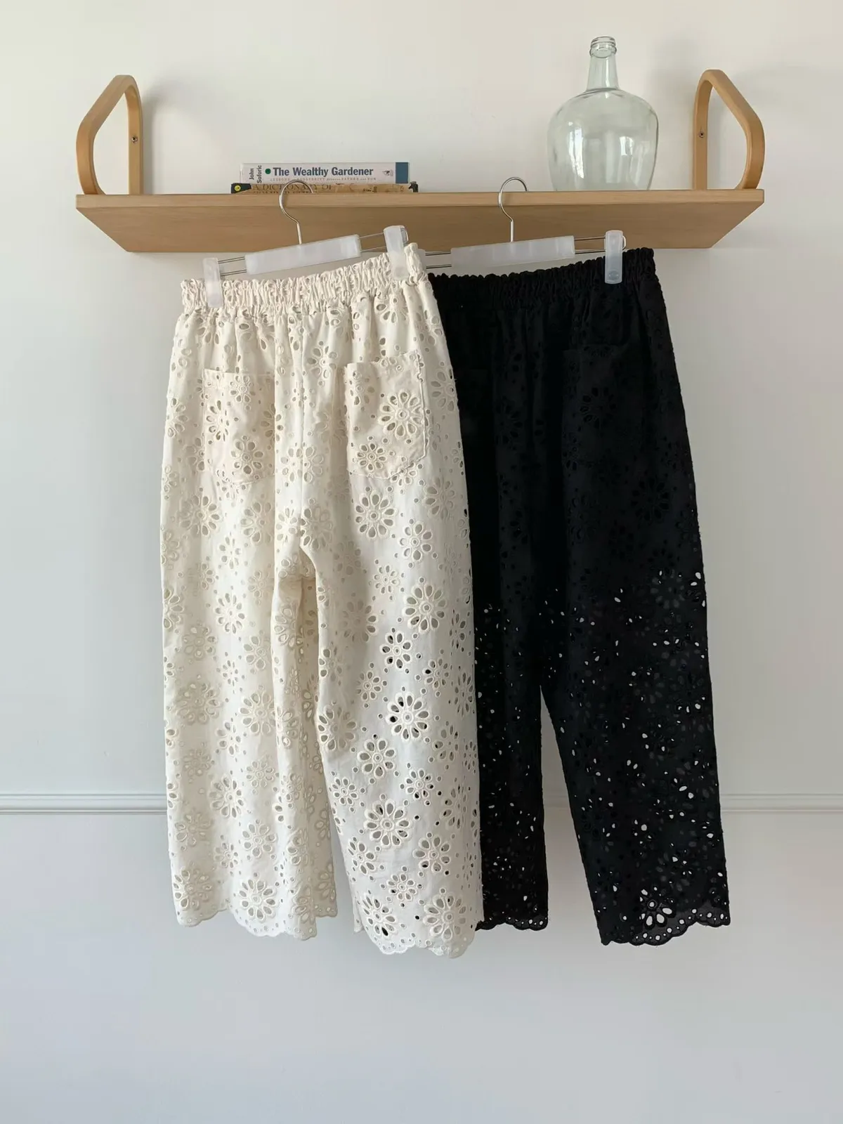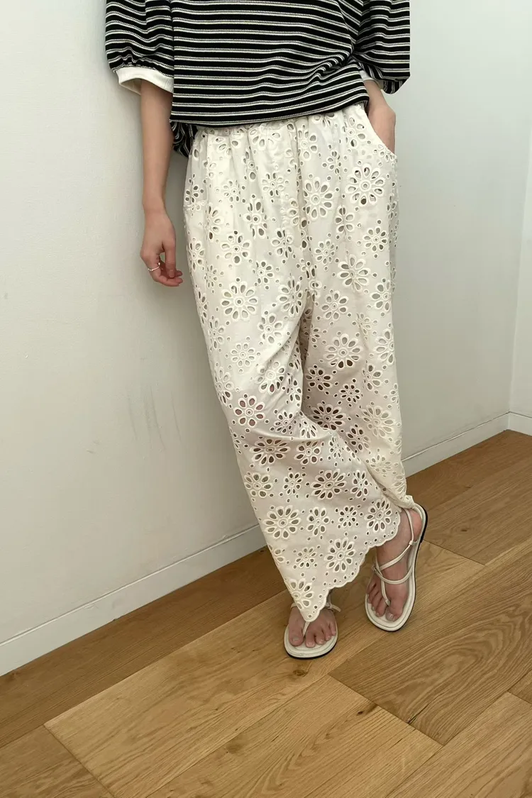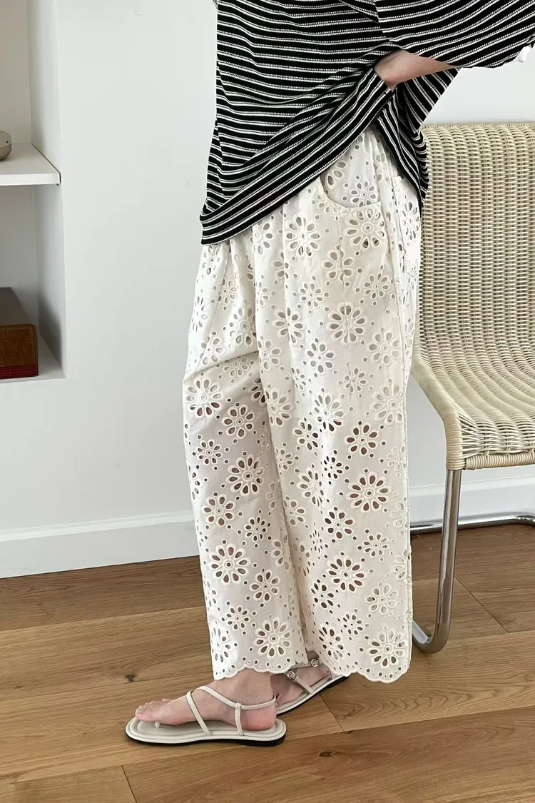 RLV30優雅透膚燒花蕾絲花瓣邊束腰長褲