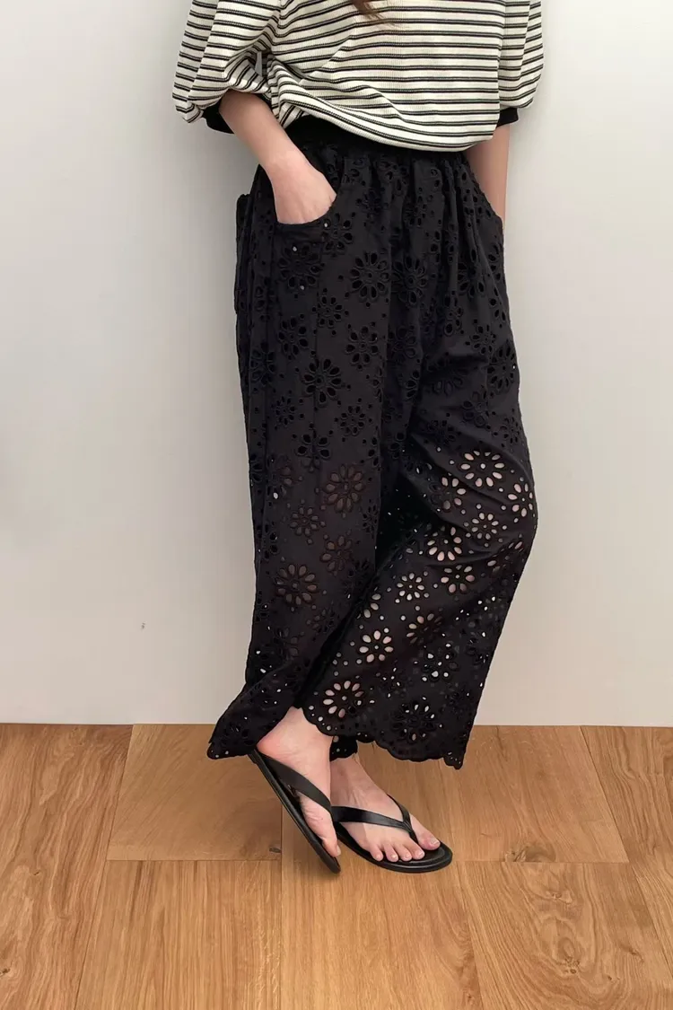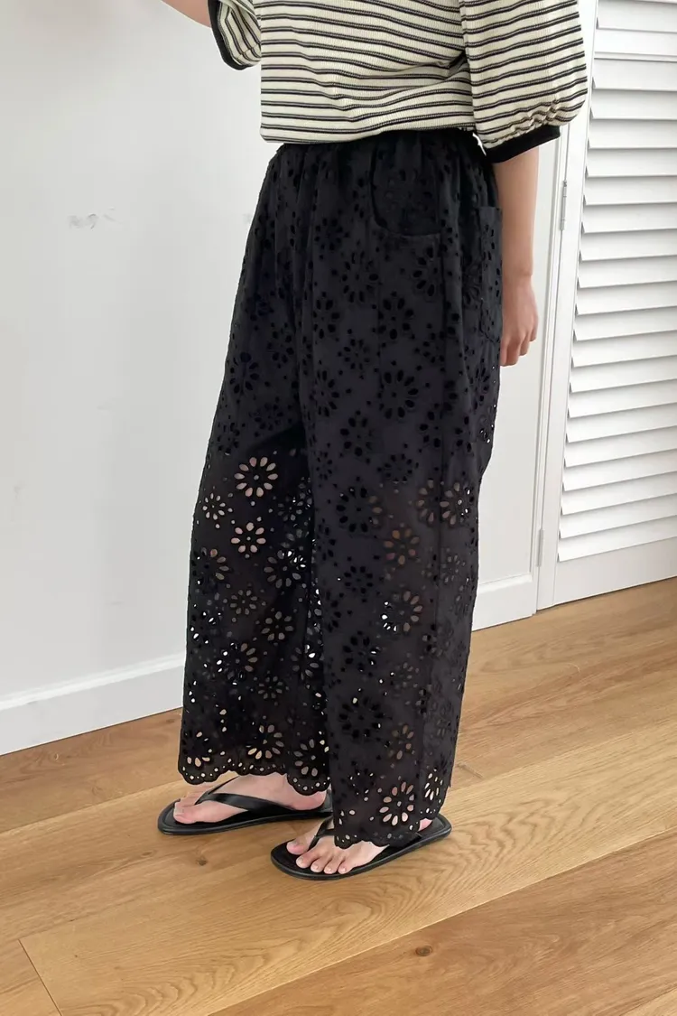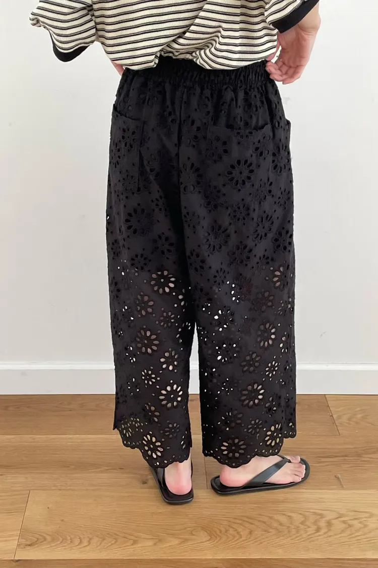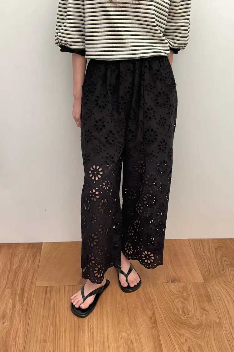 RLV30優雅透膚燒花蕾絲花瓣邊束腰長褲