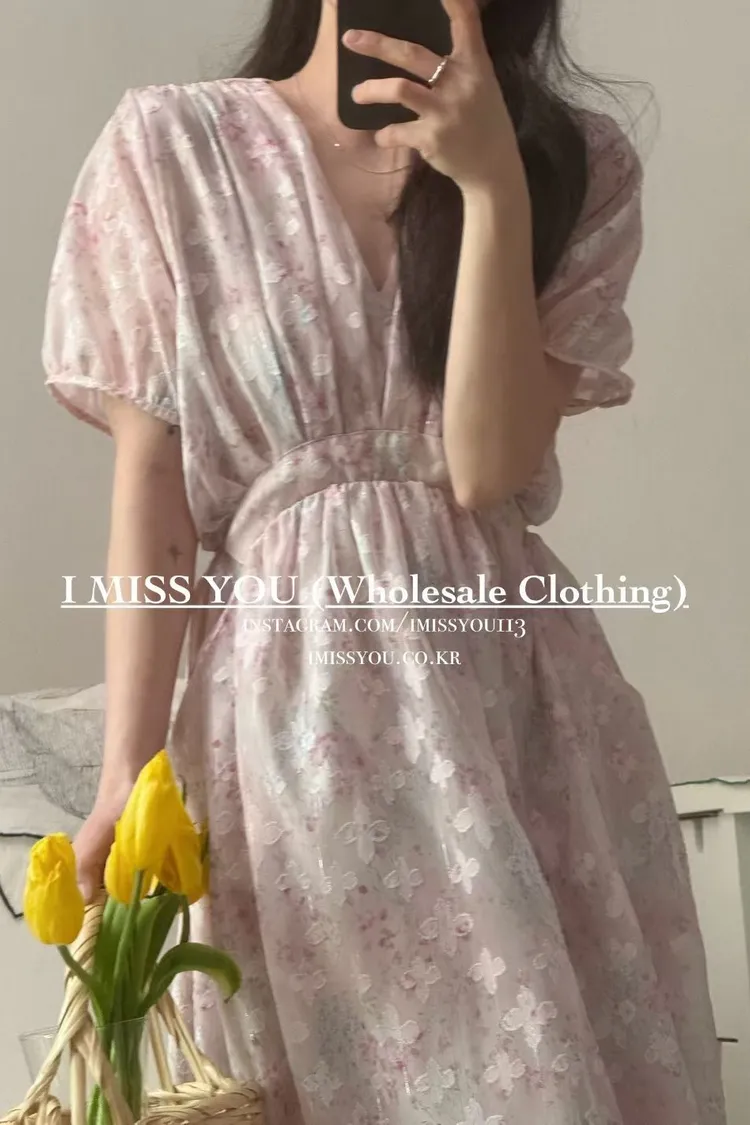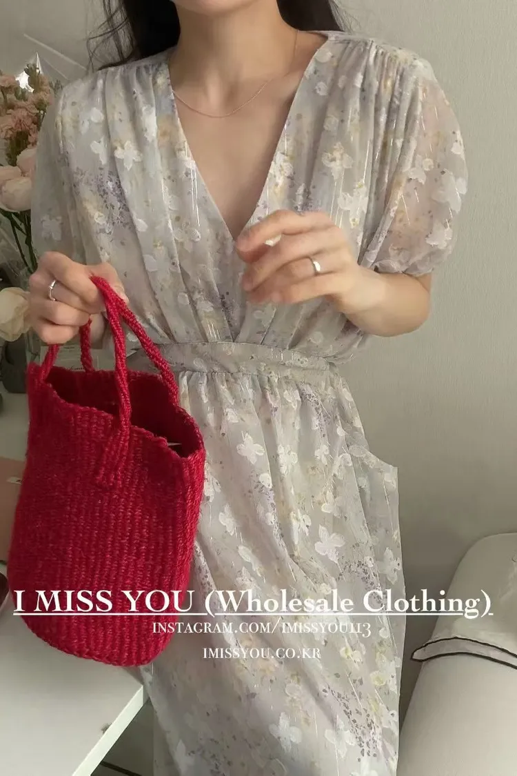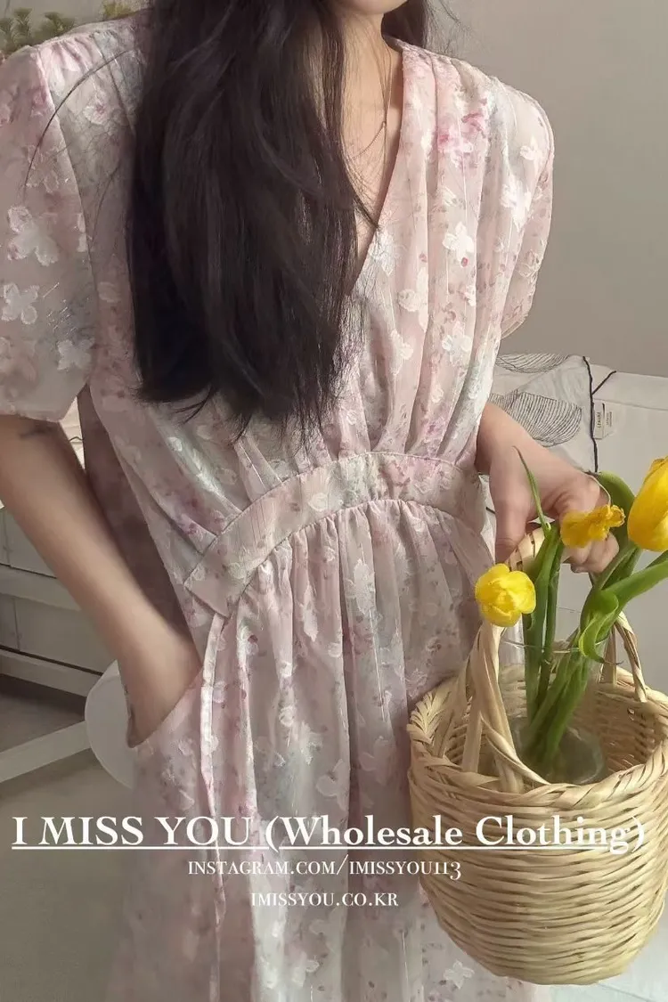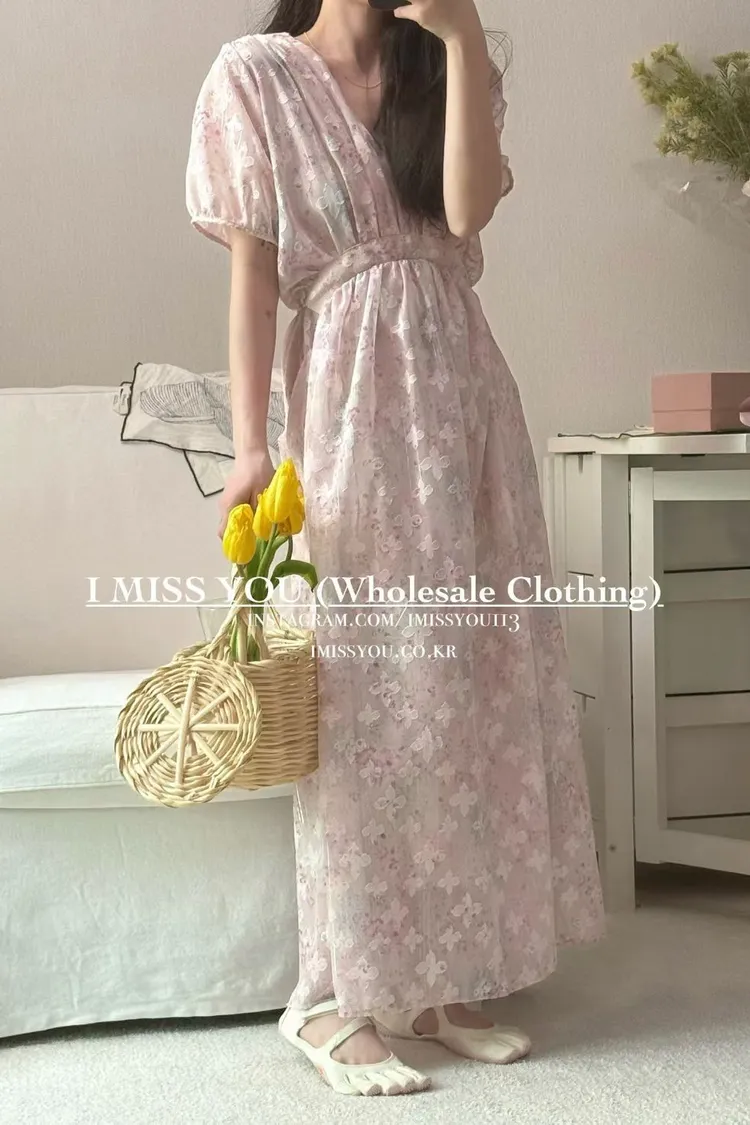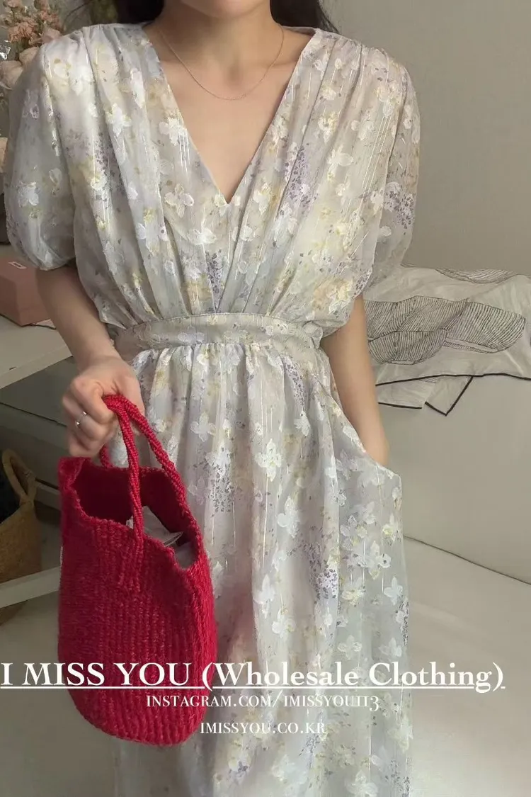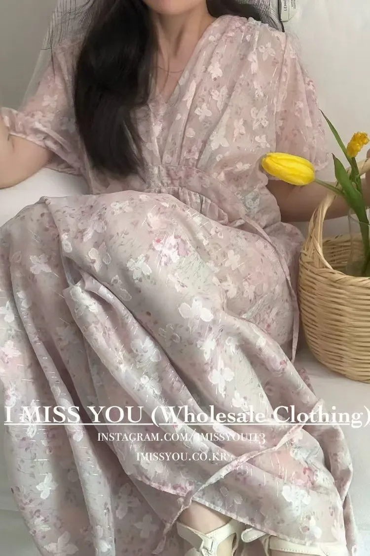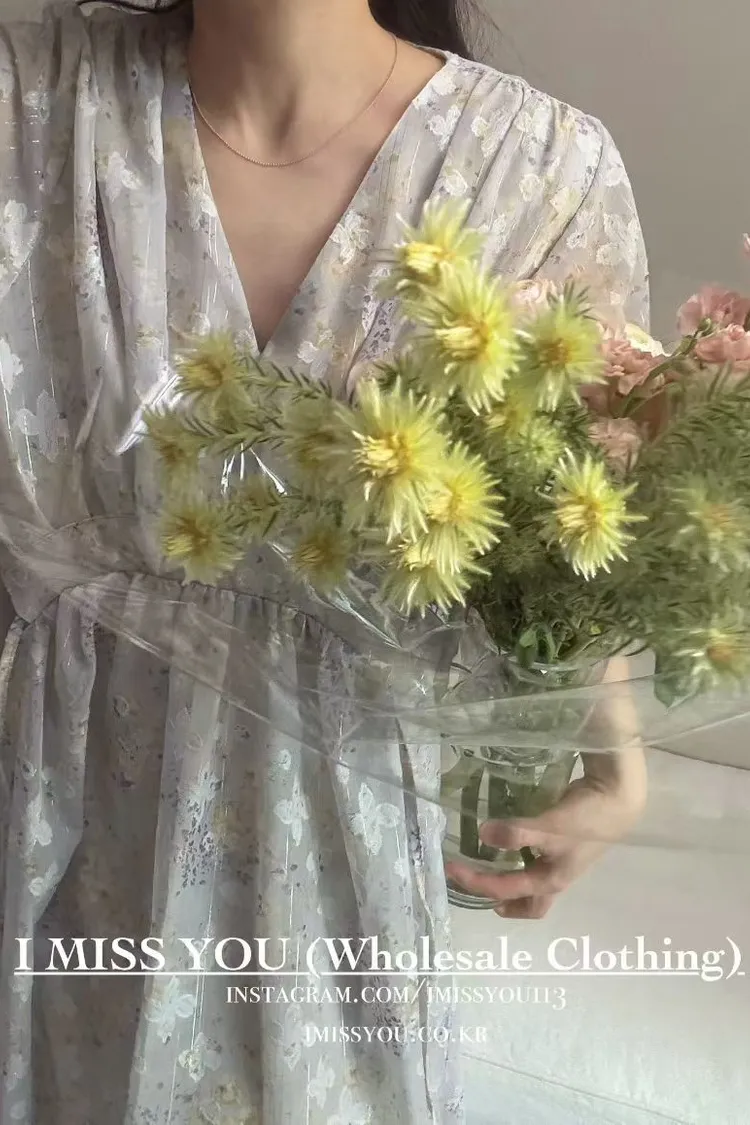 RLY05絲光緹花銀線V領高腰傘襬綁帶連身洋