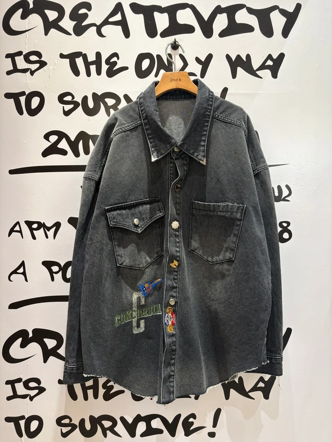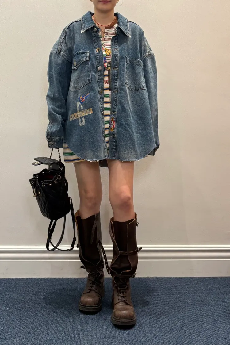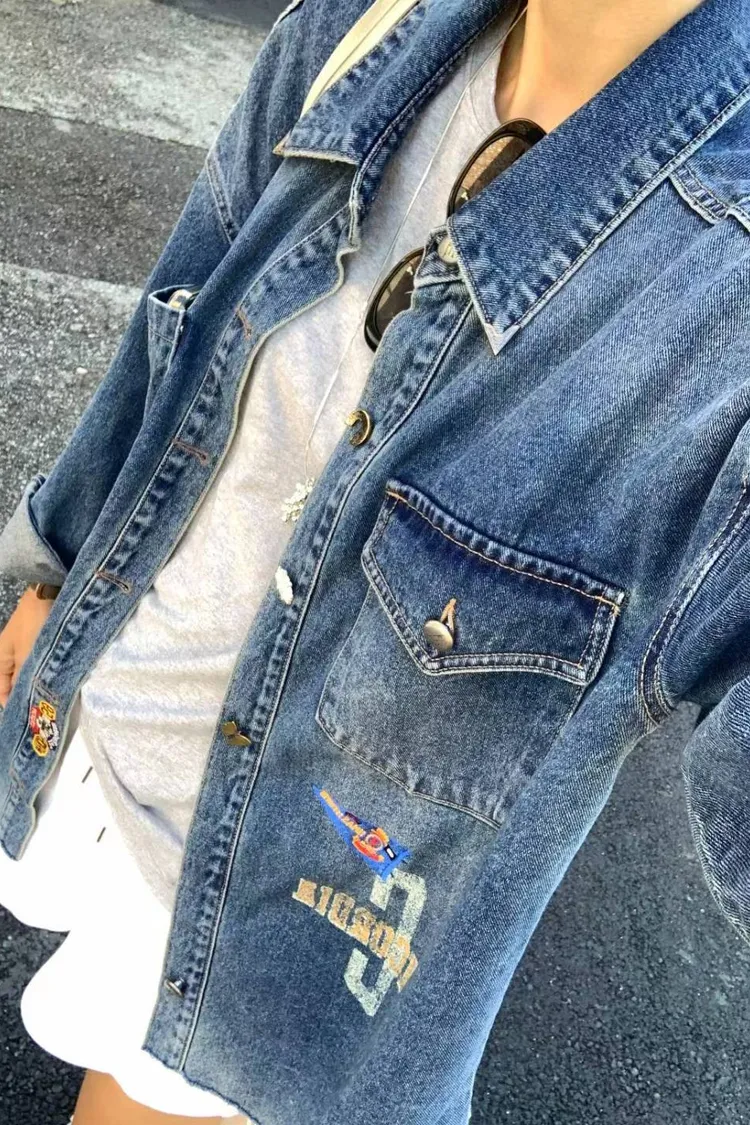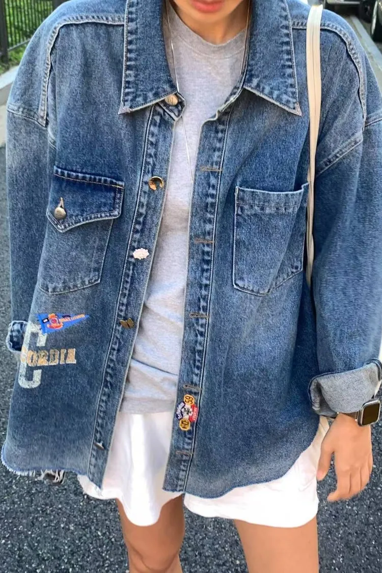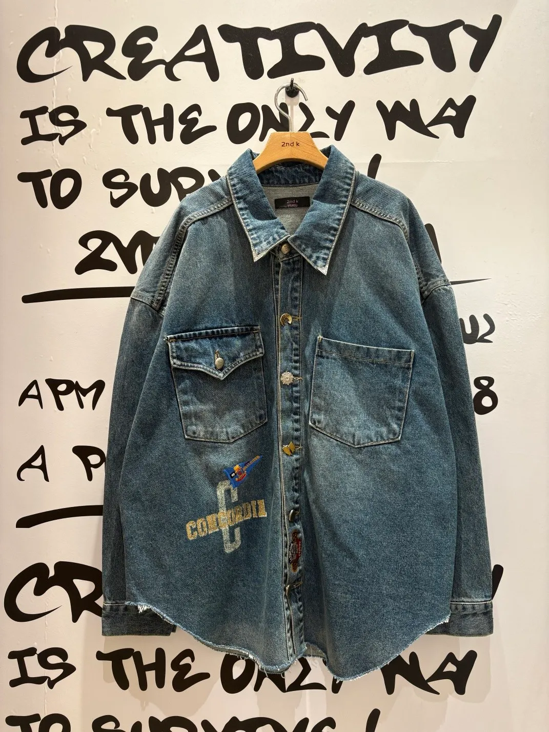 水洗牛仔面料做出滿滿復古感,落肩寬鬆蓋臀版型修飾又自在,S-XL妞都可以穿 排釦的每顆扣子都是不同的造型扣 有可愛的刺繡、翻領也有做金屬小細節 英文標語仿舊設計加上衣擺不收邊的小心機 當襯衫單穿OK,直接當外套也OK都超有型,隨便一搭就很出片 是能夠穿很久的百搭單品