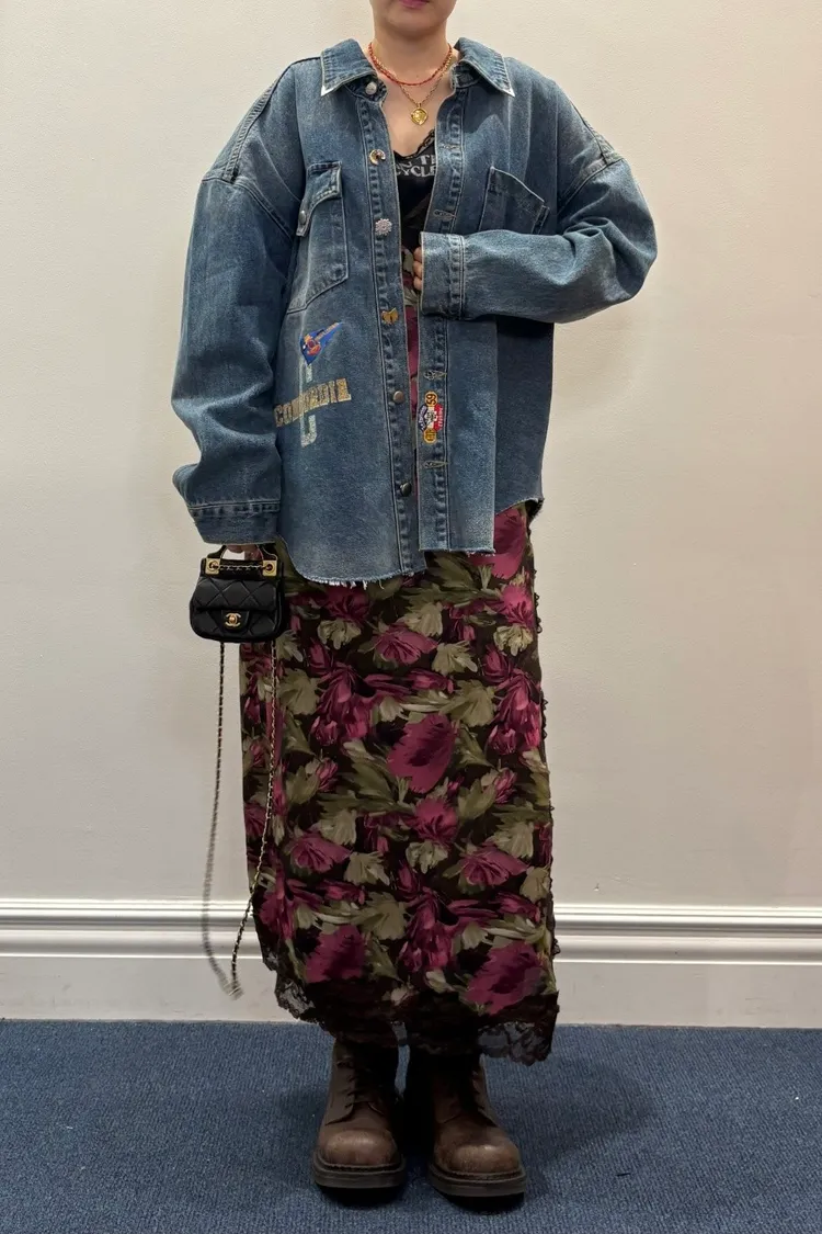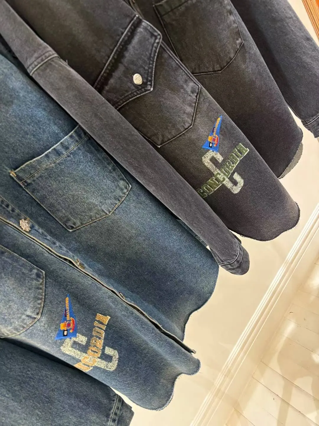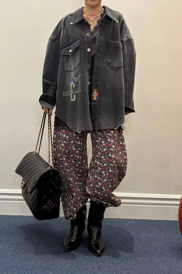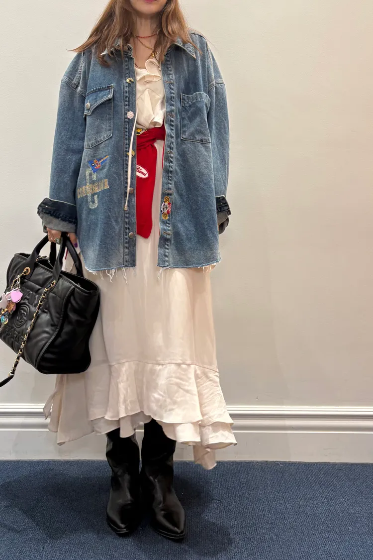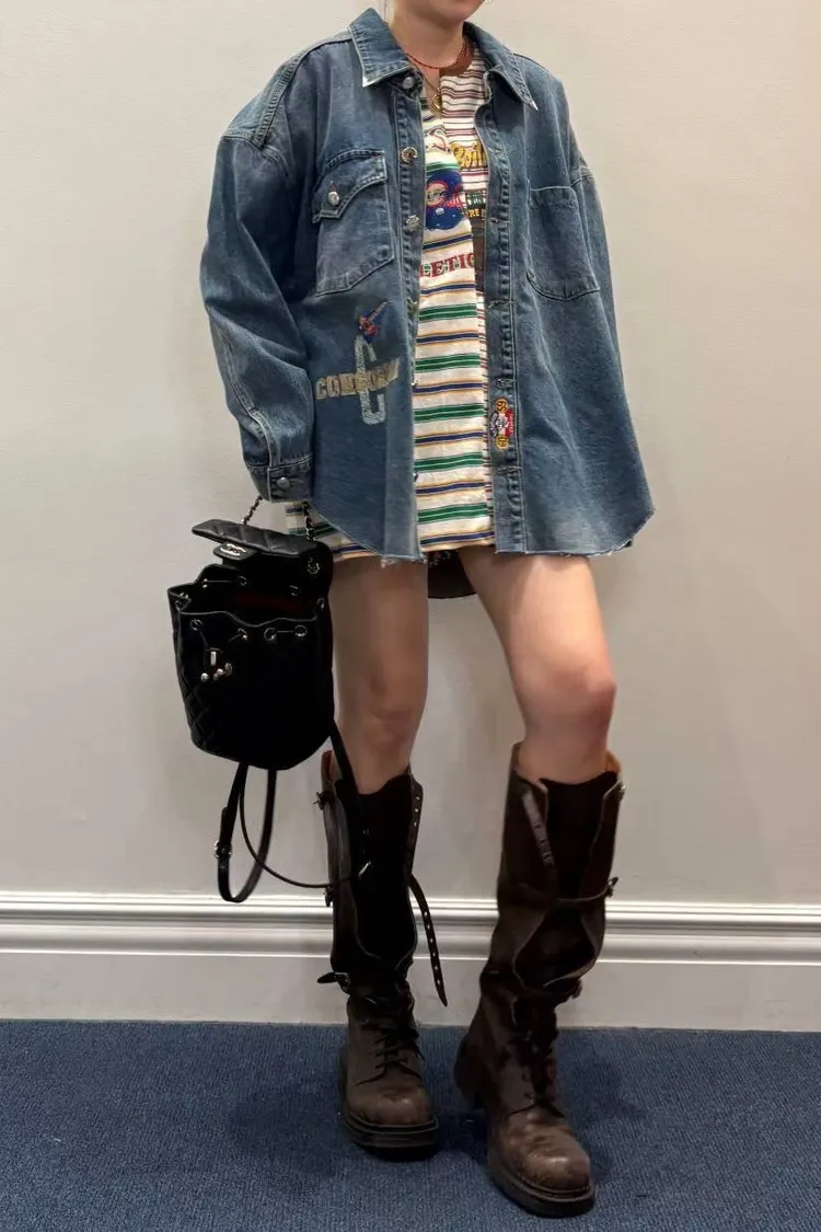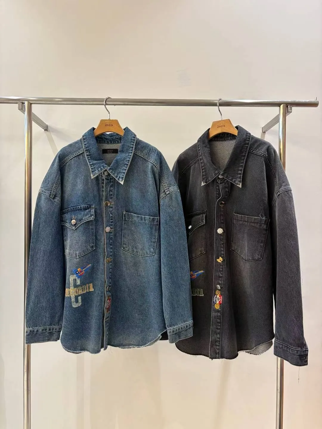 水洗牛仔面料做出滿滿復古感,落肩寬鬆蓋臀版型修飾又自在,S-XL妞都可以穿 排釦的每顆扣子都是不同的造型扣 有可愛的刺繡、翻領也有做金屬小細節 英文標語仿舊設計加上衣擺不收邊的小心機 當襯衫單穿OK,直接當外套也OK都超有型,隨便一搭就很出片 是能夠穿很久的百搭單品